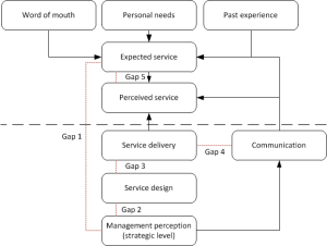 This gap is related to non-conformities that occur during the service delivery. In case of tangible product it is enough if it conforms the specification. In case of services there is much more: even smile or lack of it can have impact on perceived quality. Every problem encountered by customer (before, during or after the service delivery) can increase this gap.