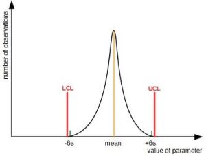 We want all the products to be within control lines. The idea of Six sigma is to make the process very stable. This allows to reduce the standard deviation. It should be so small, that 6 standard deviations from the mean should fit between mean and each control line. In that case our we'll achieve 99.9997% correct operations.