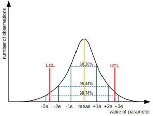 Example of normal distribution. Mean, standard deviations and control lines are shown. Many products are behind control lines - quality can be improved (not to scale)